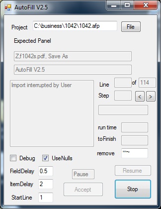 This application requires some setup, mapping the columns of the data file to the location (order) that they are used on the form. The above sample was used to fill IRS 1042 forms (PDF Format) from existing employee data. It produced a directory of completed forms that could be emailed or printed and mailed to employee.